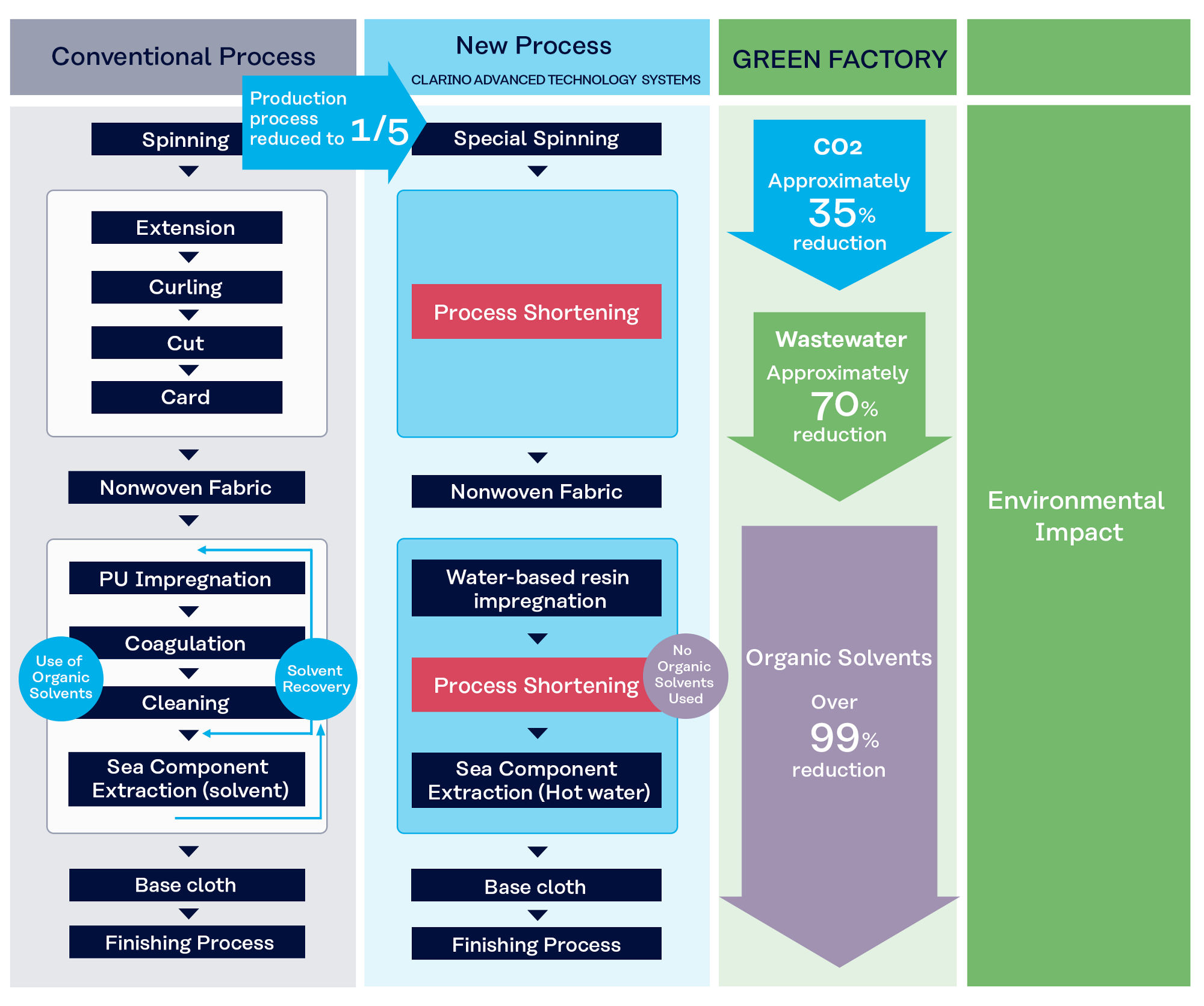 Through Kuraray’s proprietary new manufacturing process, CLARINO ADVANCED TECHNOLOGY SYSTEMS, the manufacturing process has been reduced to one-fifth of the conventional process. This material achieves over 99% reduction in organic solvent use during manufacturing, approximately 35% lower CO₂ emissions, and about 70% less wastewater.